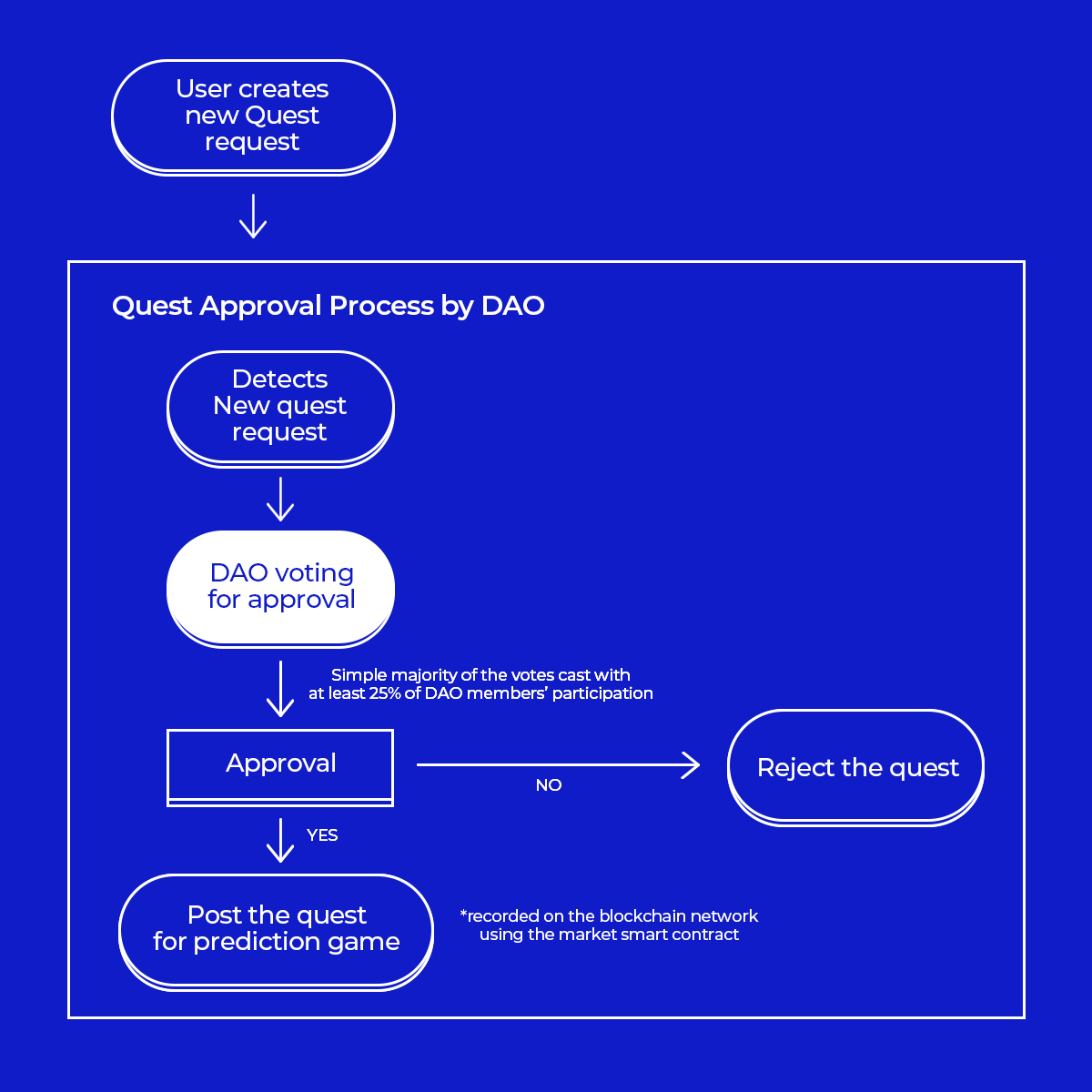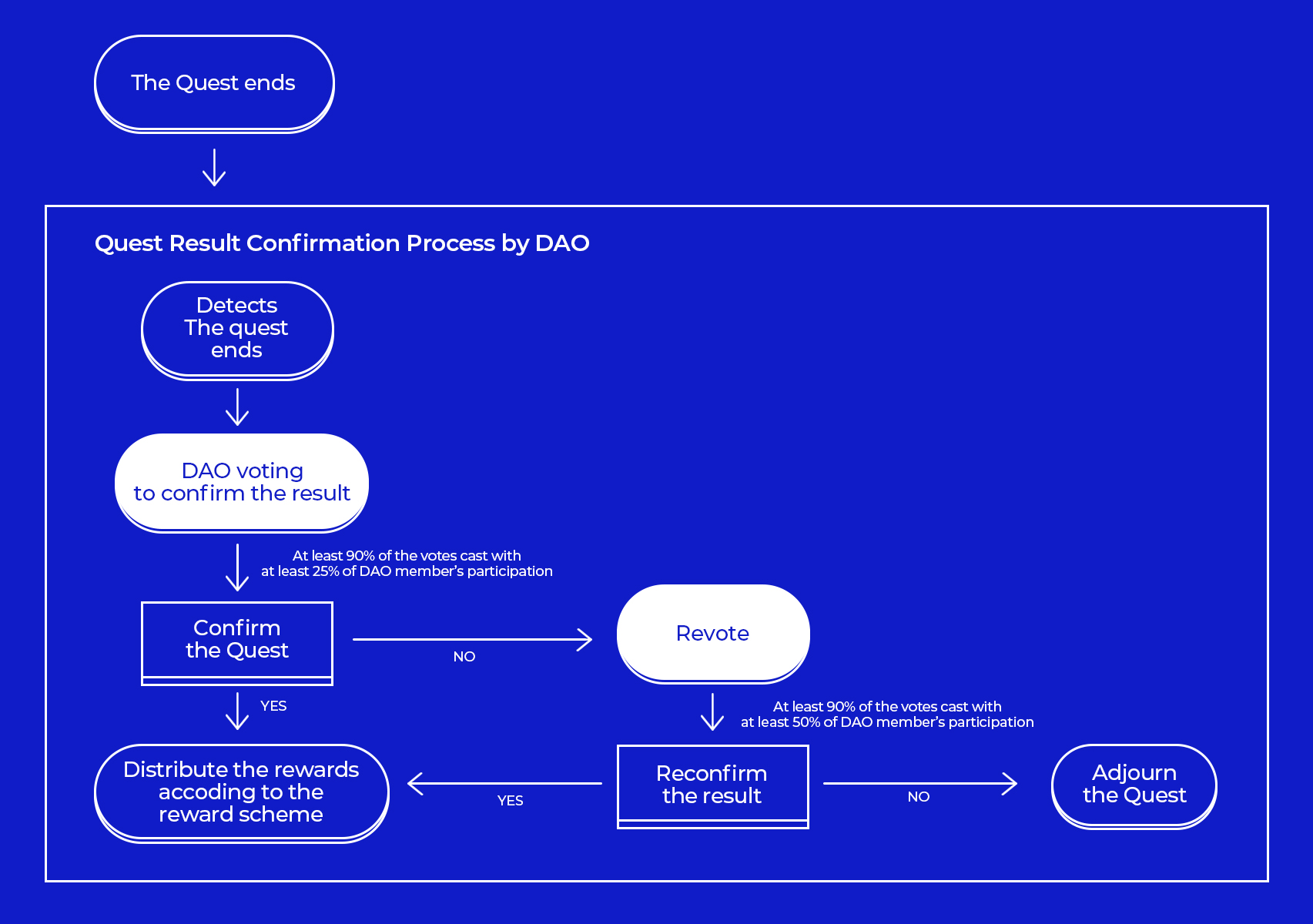 최종 결과가 요구사항을 충족하지 못하면 모든 DAO 구성원에게 재확인 절차를 거쳐 정답을 판단합니다. 이때, 퀘스트의 해결 또는 중단여부를 결정하기 위해서는 최소 90%의 투표와 DAO 회원의 50% 이상의 참여가 필요합니다.